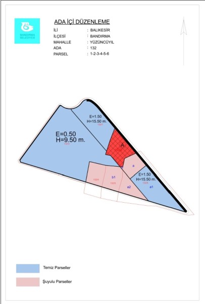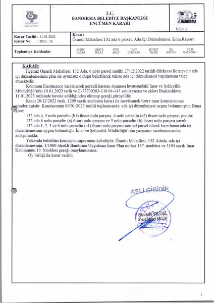 Belediye Encümeninin 11.01.2023 tarih ve 38 sayılı Encümen kararı ile Ömerli Mahallesi 132 ada 1, 2, 3, 4, 5 ve 6 parsellere ait ada içi düzenlemesinin, 1/1000 ölçekli Bandırma Uygulama İmar Planı notlarının 137. Maddesi ve 3194 sayılı İmar Kanununun 19. maddesi gereği onaylanmasına,