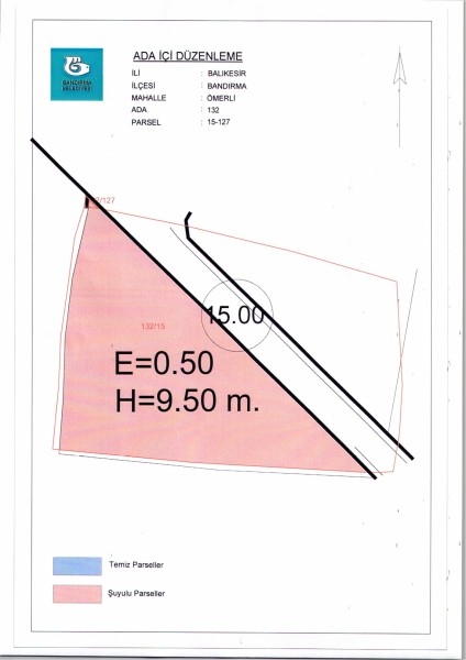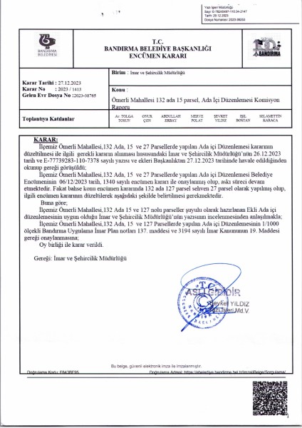 Belediye Encümeninin 27.12.2023 tarih ve 1413 sayılı Encümen kararı ile Ömerli Mahallesi, 132 ada 15 ve 127 nolu parsellere ait ada içi düzenlemesinin, 1/1000 ölçekli Bandırma Uygulama İmar Planı notlarının 137. Maddesi ve 3194 sayılı İmar Kanununun 19. maddesi gereği onaylanmasına,