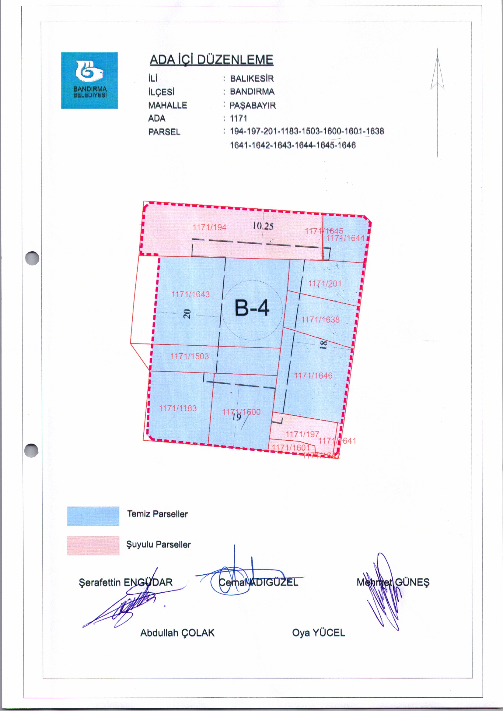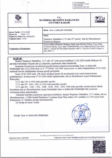 Belediye Encümeninin 25.03.2026 tarih ve 371 sayılı Encümen kararı ile, Paşabayır Mahallesi, 1171 ada, 194-197-201-1183-1503-1600-161-1638-1641-1642-1643-1644-1645-1646 nolu parsellere ait ada içi düzenlemesinin, 1/1000 ölçekli Bandırma Uygulama İmar Planı notlarının 164. Maddesi ve 3194 sayılı İmar Kanununun 19. maddesi gereği onaylanmasına,