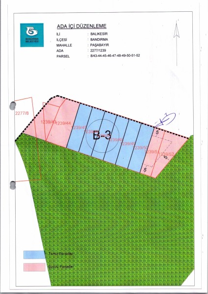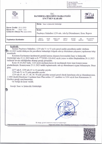 Belediye Encümeninin 29.11.2023 tarih ve 1313 sayılı Encümen kararı ile Paşabayır Mahallesi, 1239 43, ,44, 45, ,46, 47, 48, 49, 50, 51, 52 ve 2277 ada 8 parsellere ait ada içi düzenlemesinin, 1/1000 ölçekli Bandırma Uygulama İmar Planı notlarının 137. Maddesi ve 3194 sayılı İmar Kanununun 19. maddesi gereği onaylanmasına,