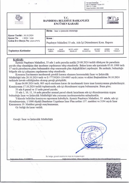 Belediye Encümeninin 30.10.2024 tarih ve 1026 sayılı Encümen kararı ile Paşabayır Mahallesi, 33 ada, 1-8-10-11-14-15 nolu parsellere ait ada içi düzenlemesinin, 1/1000 ölçekli Bandırma Uygulama İmar Planı notlarının 137. Maddesi ve 3194 sayılı İmar Kanununun 19. maddesi gereği onaylanmasına,