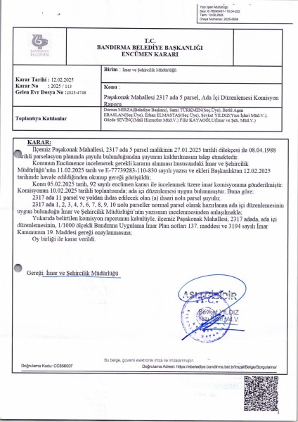 Belediye Encümeninin 12.02.2025 tarih ve 113 sayılı Encümen kararı ile Paşakonak Mahallesi, 2317 ada 1-2-3-4-5-6-7-8-9-10-11 nolu parsellere ait ada içi düzenlemesinin, 1/1000 ölçekli Bandırma Uygulama İmar Planı notlarının 137. Maddesi ve 3194 sayılı İmar Kanununun 19. maddesi gereği onaylanmasına,