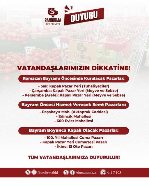 Ramazan Bayramı öncesinde kurulacak pazarlar ile bayram süresince hizmet durumu aşağıdaki gibidir:
