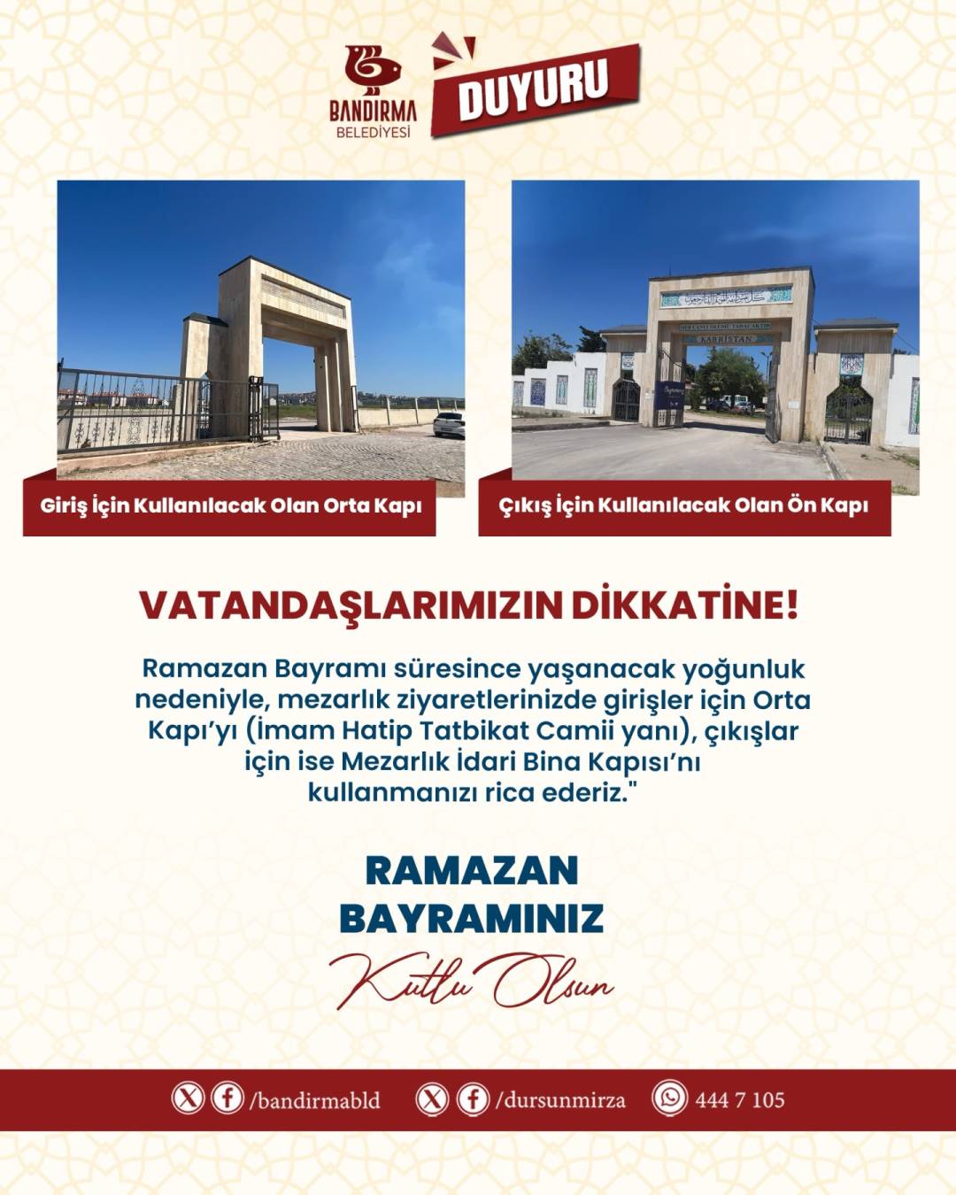 Tüm halkımıza duyurulur. Ramazan Bayramı’nız mübarek olsun.