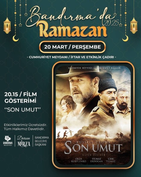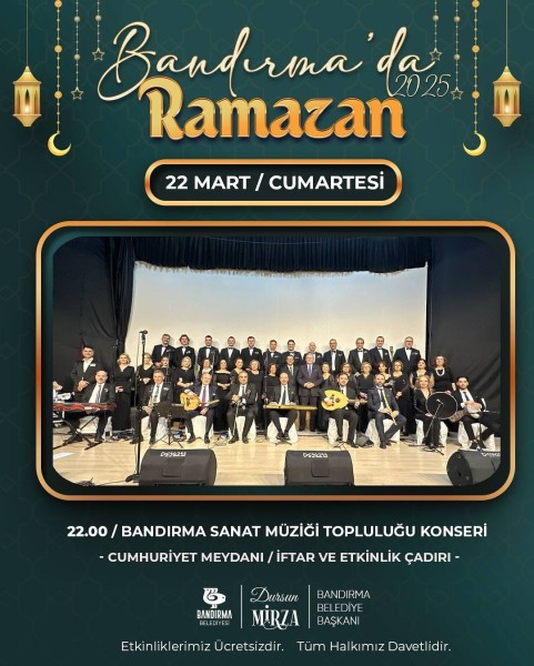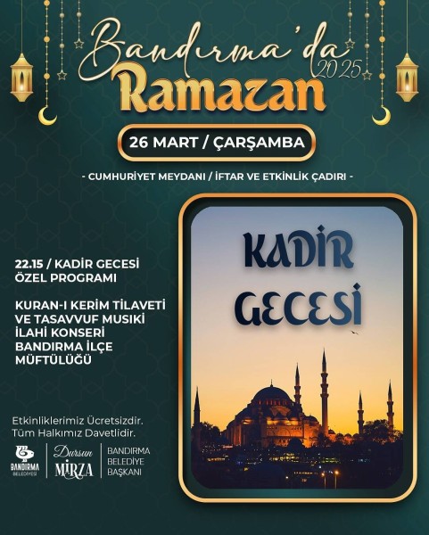 Ramazan ayının bereketini ve manevi atmosferini hep birlikte yaşayacağımız dopdolu bir etkinlik takvimiyle sizlerle buluşuyoruz! Her hafta Perşembe, Cuma ve Cumartesi günleri Cumhuriyet Meydanı’nda İftar ve Etkinlik Çadırında; dinletilerden tiyatro oyunlarına, söyleşilerden film gösterimlerine, çocuklara özel programlardan konserlere kadar birçok etkinlikle bir araya geliyoruz. 26 Mart Çarşamba - Kadir Gecesi Özel Programı Konserler Tiyatro ve Sinema Gösterimleri Söyleşi ve İmza Günleri Çocuk Etkinlikleri Kadir Gecesi Özel Programı Cumhuriyet Meydanı - İftar ve Etkinlik Çadırı Etkinliklerimiz ücretsizdir ve tüm halkımız davetlidir!
