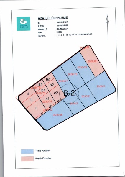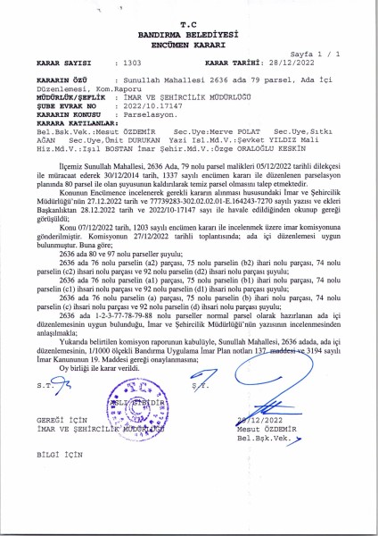 Belediye Encümeninin 28/12/2022 tarih ve 1303 sayılı Encümen kararı ile Sunullah Mahallesi, 2636 adaya ait ada içi düzenlemesinin, 1/1000 ölçekli Bandırma Uygulama İmar Planı notlarının 137. Maddesi ve 3194 sayılı İmar Kanununun 19. maddesi gereği onaylanmasına,