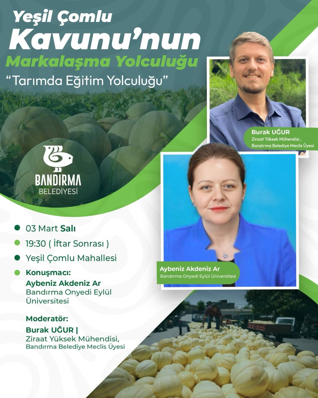 Bilimsel bilgi, yerel üretim gücü ve markalaşma vizyonu bu buluşmada bir araya geliyor. Yerel değerlerimizi koruyarak büyütmek, Üreticimizin emeğini güçlendirmek, Yeşil Çomlu Kavunu’nu bir marka haline getirmek için hep birlikte konuşacağız.
