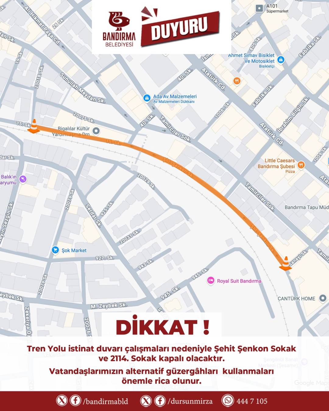 Vatandaşlarımızın güvenliği için çalışmalar tamamlanana kadar alternatif güzergâhları kullanmalarını önemle rica ederiz.