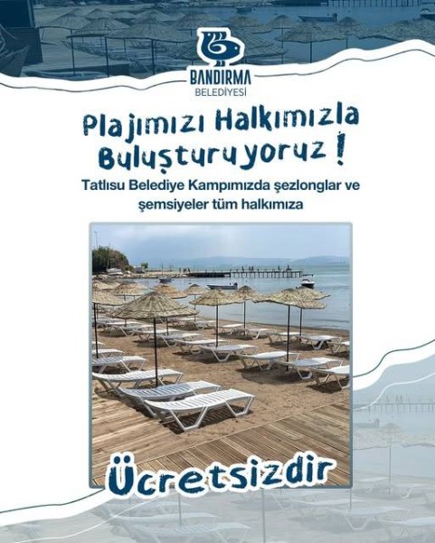 Yaz güneşi Tatlısu’da bir başka güzel! Belediyemize ait Tatlısu Kamp Alanı’ndaki plajımızı halkımızın kullanımına açtık. Tüm hemşehrilerimiz şezlong ve şemsiyelerden ücretsiz olarak faydalanabilir. Eşit hizmet, herkes için tatil! Bandırma’mızda sosyal belediyecilik anlayışımızla yaşamı kolaylaştırmaya devam ediyoruz.