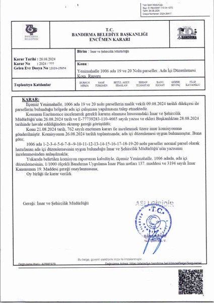 Belediye Encümeninin 28.08.2024 tarih ve 777 sayılı Encümen kararı ile Yenimahalle, 1006 ada 1-2-3-4-5-6-7-8-9-10-11-12-13-14-15-16-17-18-19-20 nolu parsellere ait ada içi düzenlemesinin, 1/1000 ölçekli Bandırma Uygulama İmar Planı notlarının 137. Maddesi ve 3194 sayılı İmar Kanununun 19. maddesi gereği onaylanmasına,