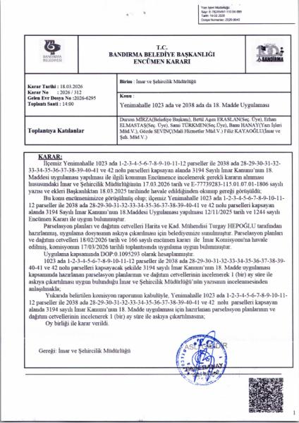 İlçemiz Yenimahalle 1023 Ada 1-2-3-4-5-6-7-8-9-10-11-12 nolu parseller ve 2038 ada 28-29-30-31-32-334-34-35-36-37-38-39-40-41-42 nolu parselleri kapsayan alanda 3194 Sayılı İmar Kanununun 18. Madde uygulama çalışmalarına ait dağıtım cetvelleri ve parselasyon planları (1) Bir ay süre ile İmar ve Şehircilik Müdürlüğü’nde ve Belediyemiz ilan panosunda ilan edilecektir.