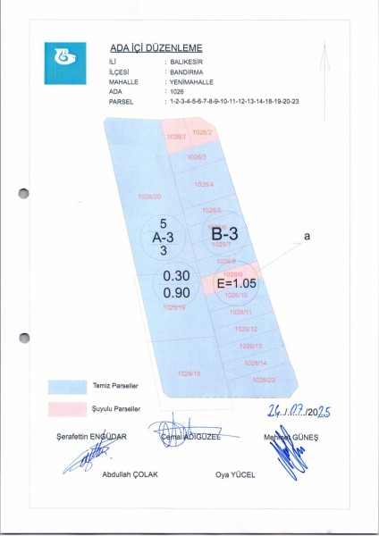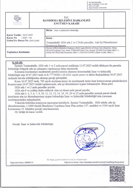 Belediye Encümeninin 30.07.2025 tarih ve 750 sayılı Encümen kararı ile, Yenimahalle, 1026 ada 1, 2, 3, 4, 5, 6, 7, 8, 9, 10, 11, 12, 13, 14, 18, 19, 20, 23 nolu parsellere ait ada içi düzenlemesinin, 1/1000 ölçekli Bandırma Uygulama İmar Planı notlarının 137. Maddesi ve 3194 sayılı İmar Kanununun 19. maddesi gereği onaylanmasına,