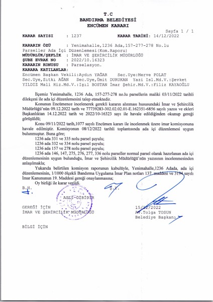 Belediye Encümeninin 14/12/2022 tarih ve 1237 sayılı Encümen kararı ile Yenimahalle, 1236 adaya ait ada içi düzenlemesinin, 1/1000 ölçekli Bandırma Uygulama İmar Planı notlarının 137. Maddesi ve 3194 sayılı İmar Kanununun 19. maddesi gereği onaylanmasına,