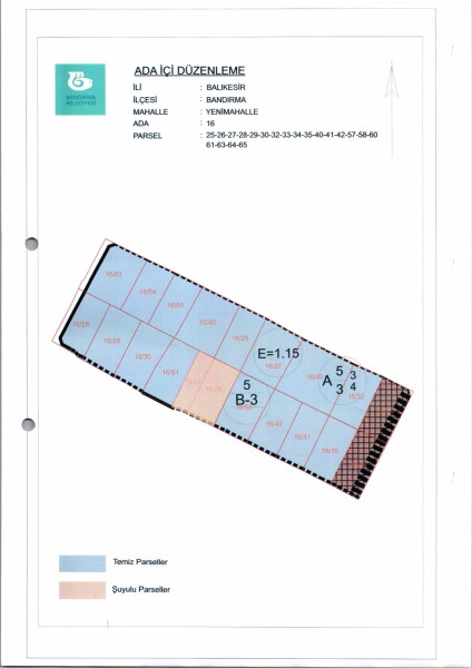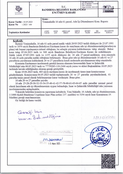 Belediye Encümeninin 10.05.2023 tarih ve 459 sayılı Encümen kararı ile Yenimahalle 16 ada 25-26-27-28-29-30-32-33-34-35-40-41-42-57-58-60-61-63-64-65 parsellere ait ada içi düzenlemesinin, 1/1000 ölçekli Bandırma Uygulama İmar Planı notlarının 137. Maddesi ve 3194 sayılı İmar Kanununun 19. maddesi gereği onaylanmasına,