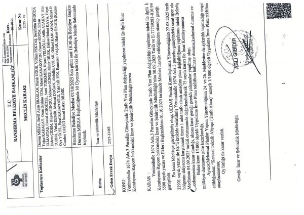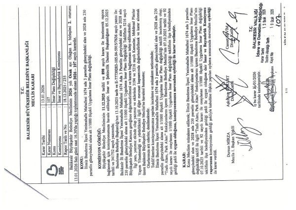 Onaylanan, Plan değişikliği teklifi Balıkesir Büyükşehir Belediyesi Meclisinin 13.01.2026 tarih ve 107 sayılı kararı ile onanmış olup, 3194 sayılı İmar Kanunun 8/b maddesine istinaden bir ay süre ile ilan edilmek üzere askıya çıkarılmış olup; Belediyemiz İnternet sitesinde yayınlanmaktadır.