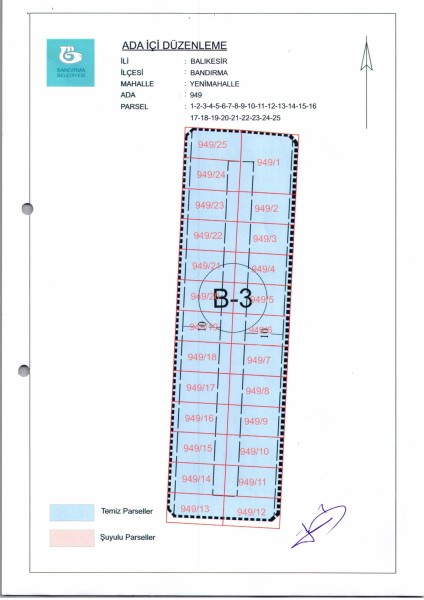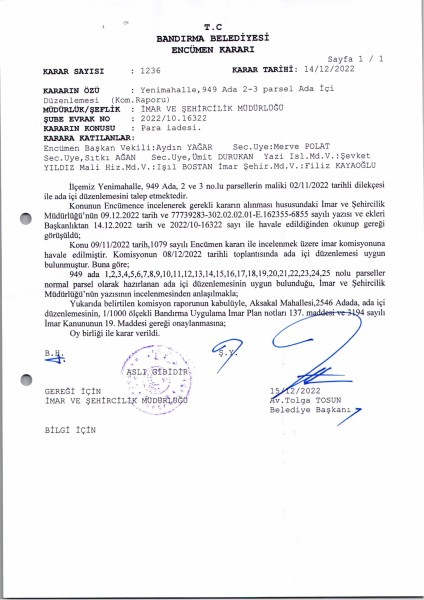 Belediye Encümeninin 14/12/2022 tarih ve 1236 sayılı Encümen kararı ile Yenimahalle, 949 adaya ait ada içi düzenlemesinin, 1/1000 ölçekli Bandırma Uygulama İmar Planı notlarının 137. Maddesi ve 3194 sayılı İmar Kanununun 19. maddesi gereği onaylanmasına,