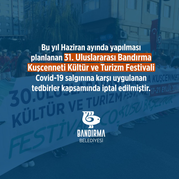Bu yıl, 1-10 Haziran’da 31.sini düzenlemeyi planladığımız Uluslararası Bandırma Kuşcenneti Kültür ve Turizm Festivalimizi dünyayı etkisi altına alan ve ülkemizde de yaygınlaşmasına