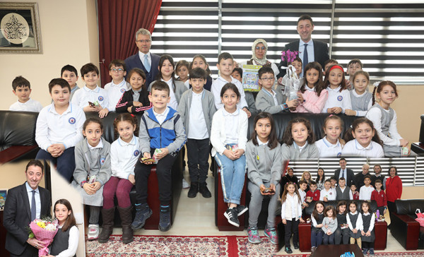 Bandırma Cumhuriyet İlkokulu Müdürü Mustafa Akgül, 3/G Sınıf Öğretmeni Raziye Güneş ve 3/G sınıfı öğrencileri, Durakta Matematik Projesi’ne destek olduğu için Belediye Başkanı Av.