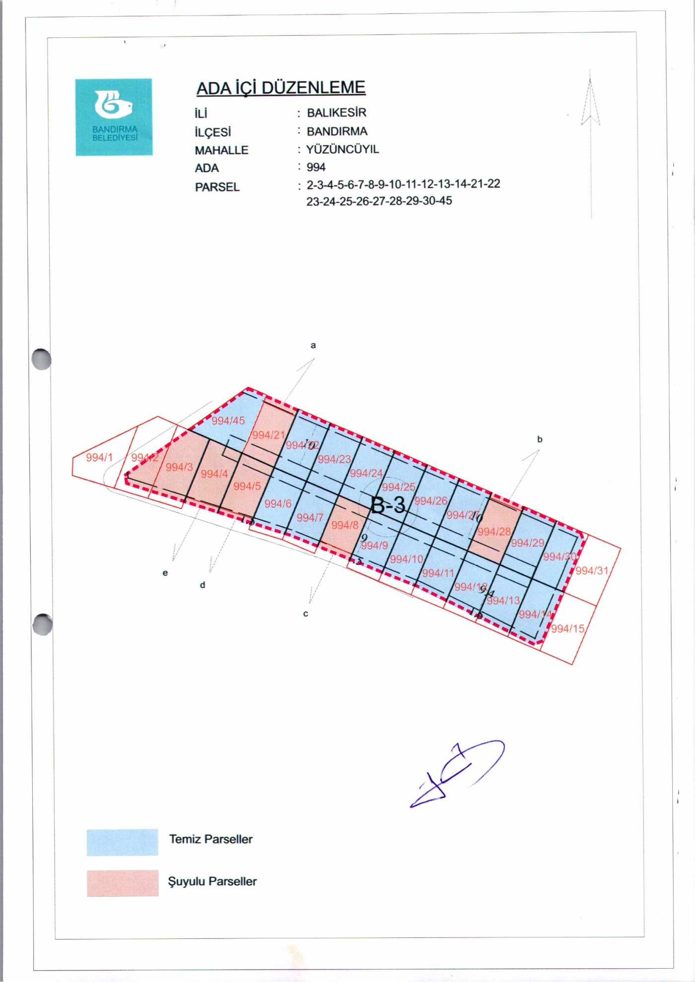 Belediye Encümeninin 08.03.2023 tarih ve 274 sayılı Encümen kararı ile 600 Evler Mahallesi 994 ada 2-3-4-5-6-7-8-9-10-11-12-13-14-21-22-23-24-25-26-27-28-29-30-45 parsellere ait ada içi düzenlemesinin, 1/1000 ölçekli Bandırma Uygulama İmar Planı notlarının 137. Maddesi ve 3194 sayılı İmar Kanununun 19. maddesi gereği onaylanmasına,