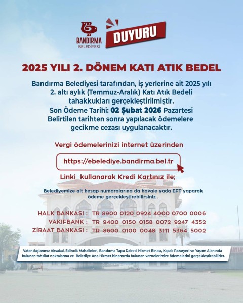 📢 Bandırma Belediyesi tarafından iş yerlerine ait 2025 yılı 2. altı aylık (Temmuz–Aralık) Katı Atık Bedeli tahakkukları gerçekleştirilmiştir.