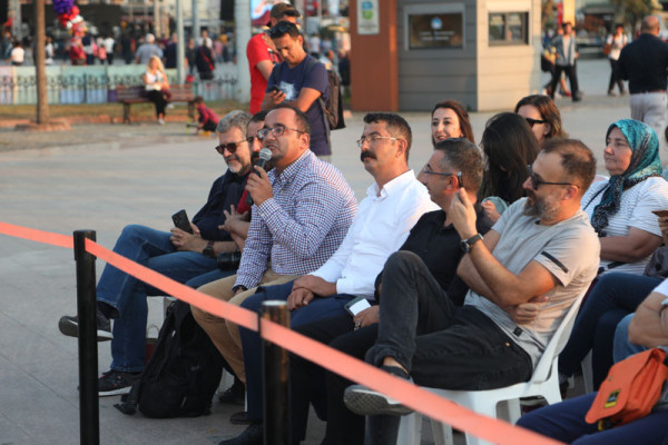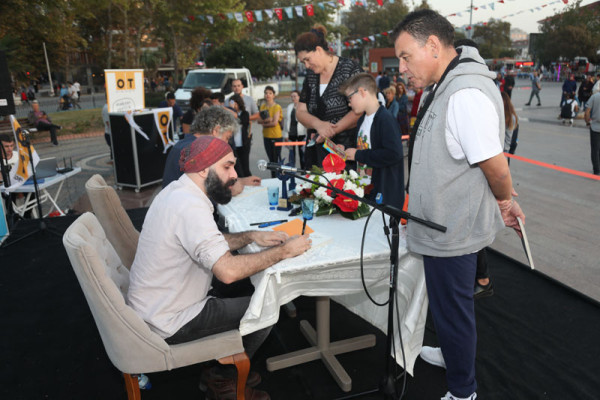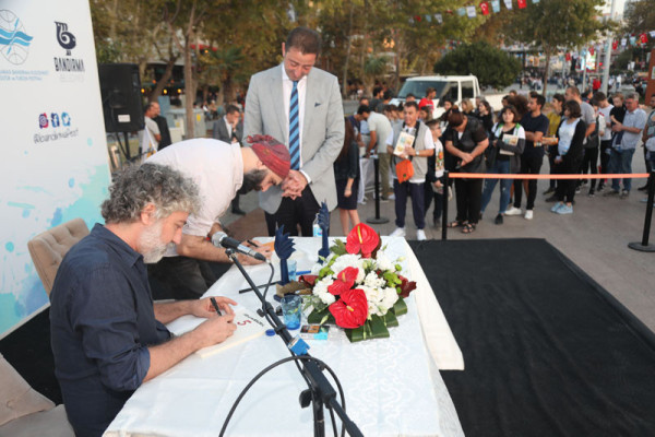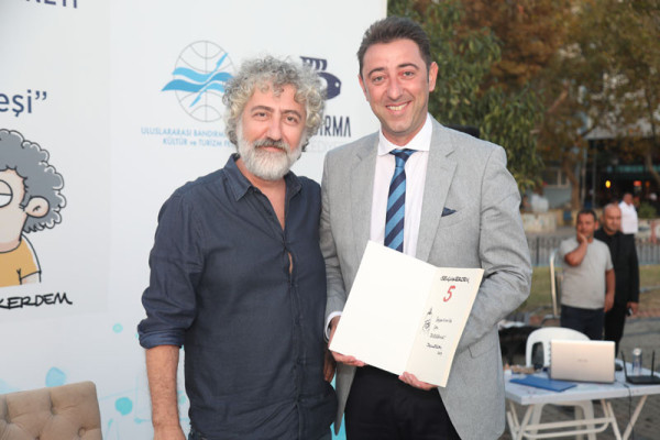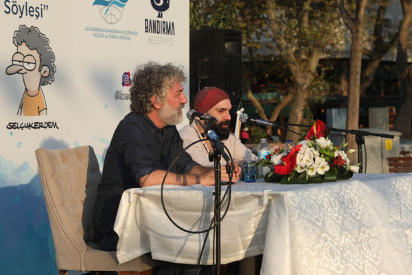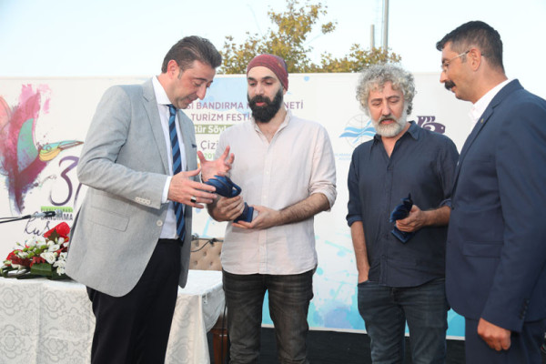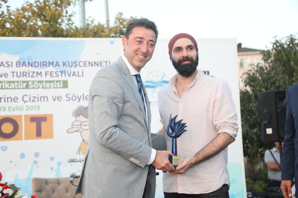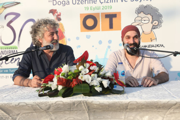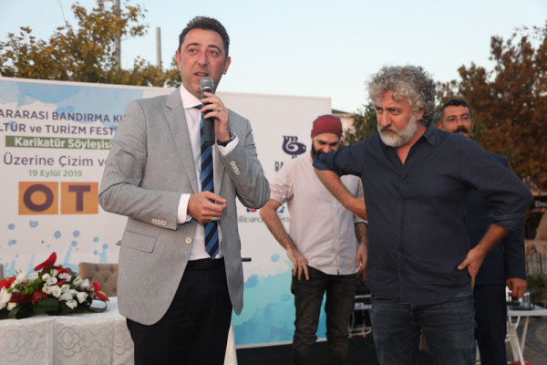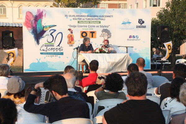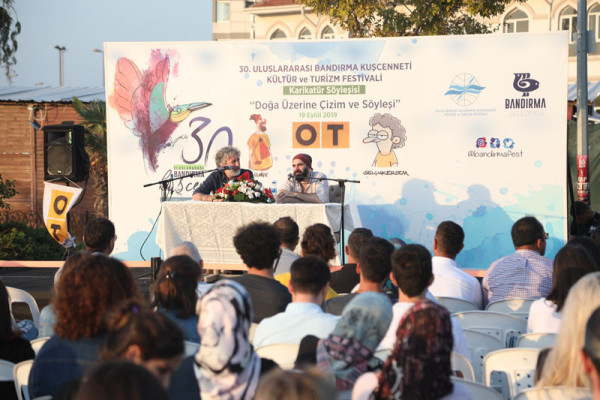30. FESTİVAL KAPSAMINDA DÜZENLENEN KARİKATÜR SÖYLEŞİSİNE İLGİ YOĞUN OLDU   30. Uluslararası Bandırma Kuşcenneti Kültür ve Turizm Festivali kapsamında düzenlenen etkinliklerimiz tüm hızıyla devam ediyor.   Festivalimizin 3. Gününde Penguen dergisinin kurucusu ve şu anda OT dergisinde çizerliğe devam eden Selçuk Erdem ve “Güldür Yüzümü” adlı kitabın yazarı ve OT dergisinde çizer olarak devam eden Rewhat Arslan Cumhuriyet Meydanında “Doğa Üzerine Çizim ve Söyleşi” konulu panelde Bandırmalı karikatürseverler ile bir araya geldi.   Söyleşide karikatürün en hızlı tepki veren sanat dalı olduğunu belirten çizerler, karikatürcülerin sadece çizdiklerinden değil, çizmediklerinden de sorumlu olduğunu belirtti. Selçuk Erdem, çizgiyle yapılan sanatın hoşgörüyü de beraberinde getirdiğini aktardı. Söyleşi bitiminde dinleyicilerin sorularını yanıtlayan ikili soru cevap bölümünden sonra karikatür kitaplarını imzaladılar.   Söyleşinin ardından Karikatür Sanatçıları Selçuk Erdem ve Rewhat Arslan’a katılımlarından dolayı Belediye Başkanımız Av. Tolga Tosun ve Meclis Üyemiz Mesut Özdemir teşekkür ederek festival plaketini takdim ettiler.