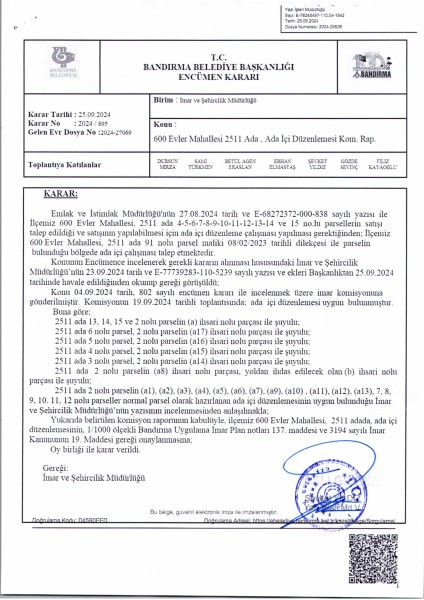 Belediye Encümeninin 25.09.2024 tarih ve 895 sayılı Encümen kararı ile 600 Evler Mahallesi, 2511 ada 2-3-4-5-6-7-8-9-10-11-12-13-14-15 nolu parsellere ait ada içi düzenlemesinin, 1/1000 ölçekli Bandırma Uygulama İmar Planı notlarının 137. Maddesi ve 3194 sayılı İmar Kanununun 19. maddesi gereği onaylanmasına,