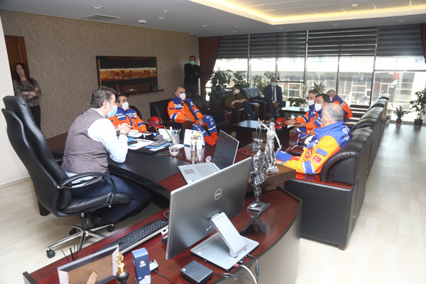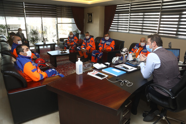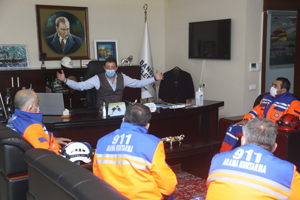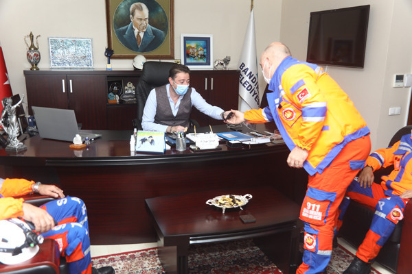 911’DEN ANLAMLI ZİYARET   Belediye Başkanı Av. Tolga Tosun, Bandırma 911 Arama Kurtarma Ekibini makamında ağırladı. 30 Ekim tarihinde İzmir’de meydana gelen depremde arama-kurtarma çalışmalarında yer alana ekibi kentimize gelişlerinde Belediye Meydanında Belediye Personeliyle birlikte karşılayan Başkan Tolga Tosun bugün de Bandırma 911 Dernek Başkanı Mustafa Gürsoy ve Ekip arkadaşlarını Başkanlık Makamında kabul etti.   Ziyarette İzmir’de arama-kurtarma çalışmalarında gösterdikleri yoğun çabadan dolayı kendilerini tebrik eden Başkan Tolga Tosun, Bandırma Belediyesi olarak afet durumunda daha hızlı bir şekilde organize olabilmek adına yapılması gereken tüm çalışmalarını 911 Arama-Kurtarma Derneğimizle birlikte yürütmeye hazır olduklarını söyledi. Başkan Tolga Tosun: “İzmir’de 30 Ekim tarihinde meydana gelen depremin ardından en hızlı şekilde organize olarak bölgeye hareket eden Bandırma 911 Arama Kurtarma Ekibini ağırlamaktan büyük mutluluk duydum. O zor zamanlarda arama kurtarma çalışmalarında büyük özveri göstererek fark yaratan ekibimizi tekrar kutluyorum. Bizler de Bandırma Belediyesi olarak depreme karşı kentimizde yapmamız gereken çalışmalarımız 911 Derneğimizle birlikte koordineli bir şekilde yürüteceğiz” dedi.   Öte yandan İzmir’deki depremin ardından bölgede yapılan arama ve kurtarma çalışmaları hakkında bilgi veren Dernek Başkanı Mustafa Gürsoy, kendilerine verdikleri desteklerden dolayı Başkan Tolga Tosun’a teşekkür ederek sözlerine başladı. Gürsoy: “Depremin hemen ardından Başkanımızın da sağladı destekle en acil şekilde İzmir’e hareket ettik. Oradaki çalışmalarda Bandırmamızı en iyi şekilde temsil ederek arama kurtarma çalışmalarında büyük özveri gösterdik. Hatta enkaz altından Ayda Bebeğimizin kurtarılması de yine bizim vardiyamızda bizim katkılarımızla gerçekleşti. Bu nedenle ayrıca mutluyuz. Bundan sonra da kentimizdeki deprem ile ilgili çalışmalarda belediyemizle koordineli bir şekilde üstümüze düşeni yapmaya hazırız” dedi.