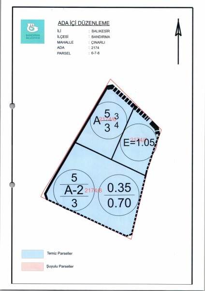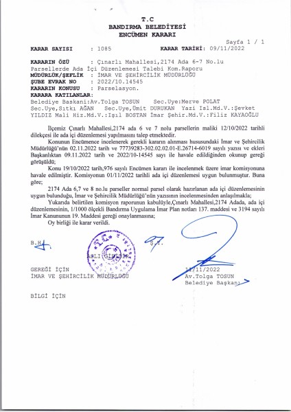 Belediye Encümeninin 09/11/2022 tarih ve 1085 sayılı Encümen kararı ile Çınarlı Mahallesi, 2174 adaya ait ada içi düzenlemesinin, 1/1000 ölçekli Bandırma Uygulama İmar Planı notlarının 137. Maddesi ve 3194 sayılı İmar Kanununun 19. maddesi gereği onaylanmasına,