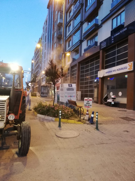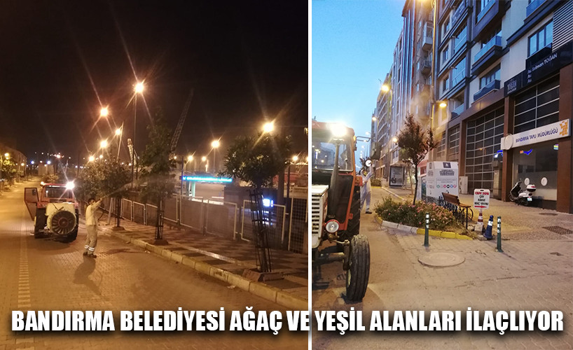 BANDIRMA BELEDİYESİ AĞAÇ VE YEŞİL ALANLARI İLAÇLIYOR   Bandırma Belediyesi ekipleri, kentimizdeki ağaçların gelişimini kuvvetlendirip sağlıklı kılmak amacıyla, ağaç ve yeşilliğe zarar veren her türlü haşereye ve hastalığa karşı ilaçlama çalışması gerçekleştiriyor.   Bandırmanın dört bir noktasında bulunan ağaçlar ve süs bitkilerinin üzerinde ilaçlama çalışmalarını sürdüren Park ve Bahçeler ekipleri, ilaçlama çalışmalarının vatandaşlarımız üzerinde herhangi bir yan etkisinin bulunmadığını belirtti. Vatandaşların rahat ve güvenli olmaları için çalışmalarını özellikle gece devam ettiren yetkililer, yeşile zarar veren her türlü haşere ve hastalıkla mücadelenin ilçede bulunan tüm yeşil alanlarda sürdürüleceğini kaydetti.