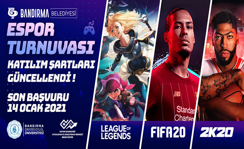 BANDIRMA BELEDİYESİ ESPOR TURNUVASI DÜZENLİYOR   Dünyada ve ülkemizde koronavirüs salgını sebebi ile evde kalan gençlerimizin ve espor alanına ilgi duyan vatandaşlarımızın kaliteli, verimli ve doğru vakit geçirebilmesi için ülkemizde federasyonu kurulu olan ve geleceğin sporu olarak görülen elektronik sporların yaygınlaştırılmasına destek olmak amacıyla Bandırma Belediyesi olarak “League of Legends 3v3, FIFA20 ve NBA2K20” oyun kategorilerinde düzenlenecek olan turnuvaya, ilçemiz sınırları içerisinde yaşayan 13 yaş üzeri herkesin katılımına açıktır. Son Başvuru Tarihi; 14 Ocak 2021 / Saat: 19.00 Fikstür Bilgilendirme Tarihi; 15 Ocak 2021 Turnuva Başlama Tarihi; 16 Ocak 2021   Turnuva Ödülleri; League of Legends (3v3); Takıma; Oyuncu klavye ve mouse seti Takıma; Kulaklık FIFA20; FIFA21 Steam Cüzdan Kodu NBA2K20; NBA2K21 Steam Cüzdan Kodu Turnuvaya Katılım ve Bilgilendirme; League of Legends (3v3); https://forms.gle/AtFJCGmei9SvaFM28 FIFA20; https://forms.gle/ypqz3Gq6Pv26vks78   NBA2K20; https://forms.gle/1dXAM9F26jAwLhor5 İletişim; 0266 711 11 11 / 2504 (Kültür ve Sosyal İşler Müdürlüğü)