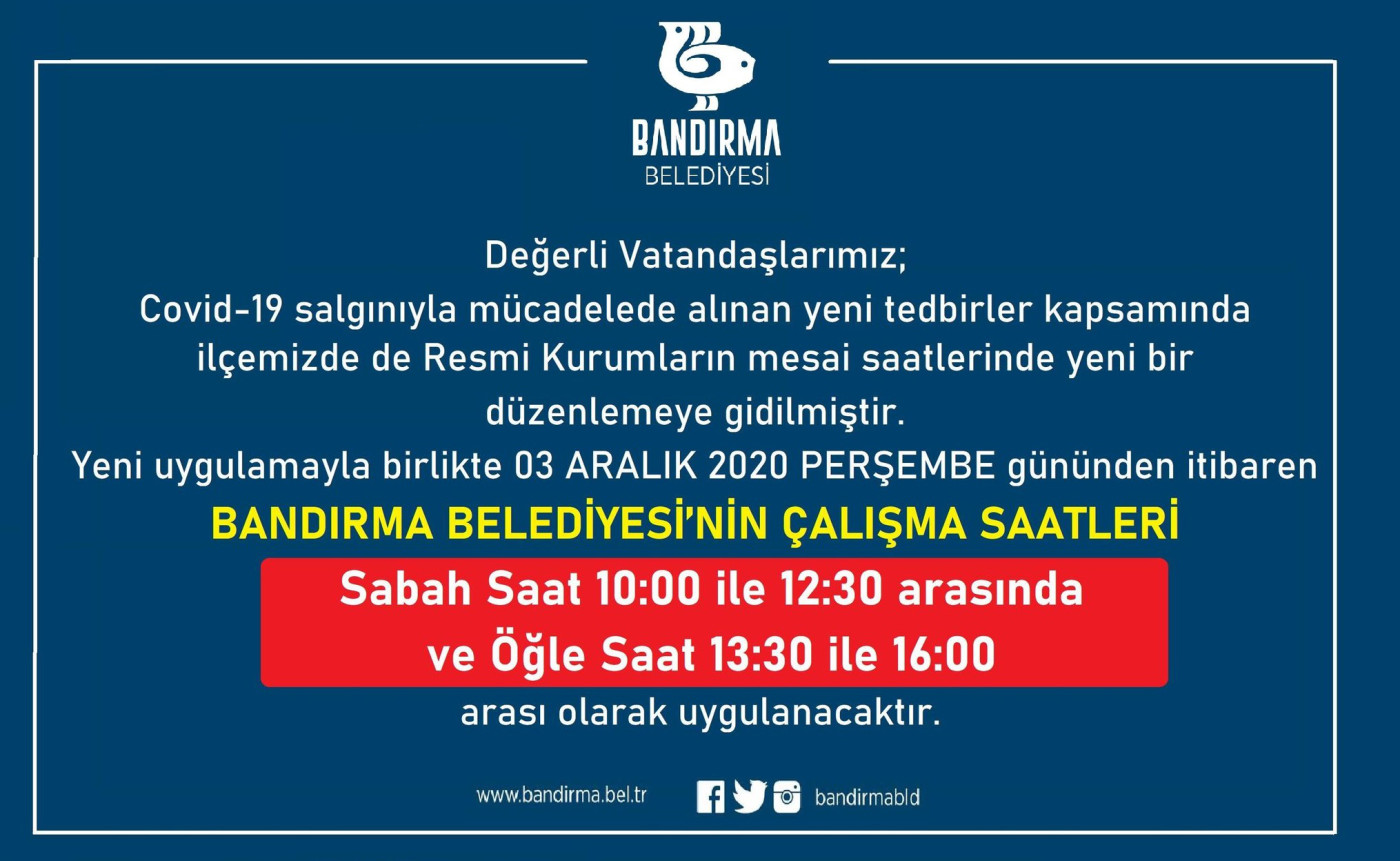 Değerli Vatandaşlarımız; Covid-19 salgınıyla mücadelede alınan yeni tedbirler kapsamında ilçemizde de Resmi Kurumların mesai saatlerinde yeni bir düzenlemeye gidilmiştir. Yeni uygulamayla birlikte 03 ARALIK 2020 PERŞEMBE gününden itibaren BANDIRMA BELEDİYESİ’NİN ÇALIŞMA SAATLERİ, Sabah Saat 10:00 ile 12:30 arasında ve Öğle Saat 13:30 ile 16:00 arası olarak uygulanacaktır.