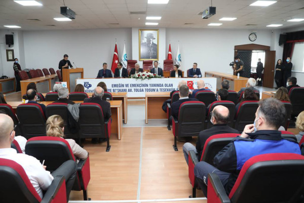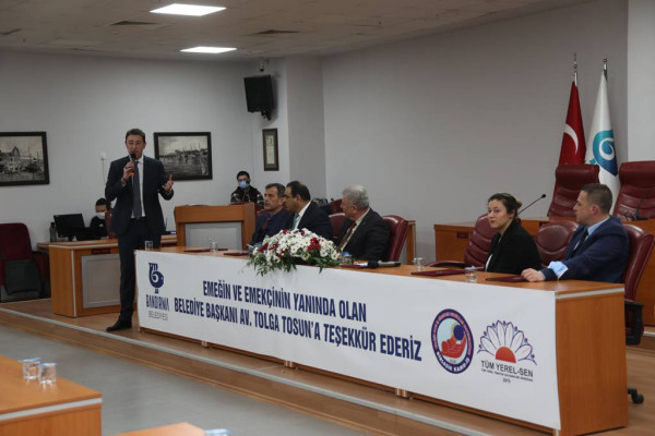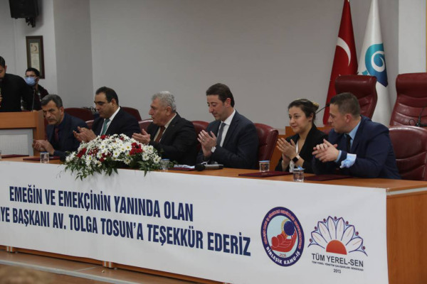 Bandırma Belediyesi ile belediye çalışanı 160 memur adına Tüm Yerel Yönetim Çalışanları Sendikası (Tüm-Yerel-Sen) sosyal denge sözleşmesi imzalandı. İmza töreni Bandırma Belediyesi Meclis Salonunda gerçekleşti. Törene; Bandırma Belediye Başkanı Av. Tolga Tosun, Başkan Yardımcıları Ozan Onur, İsmail Ay ve Metin Ok, Tüm-Yerel-Sen Genel Başkanı Arap Mucur, Bandırma Şube Başkanı Sezer Yıldız, sendika üyeleri, Bandırma Belediyesi daire amirleri ve çalışanlar katıldı. 1 Ocak 2022’den itibaren geçerli olacak olan, sosyal denge sözleşmesi imza töreninde konuşan Belediye Başkanı Av. Tolga Tosun: “Yaklaşık iki yıldır pandemi ile mücadele ediyoruz. Bu dönemde çalışanlarımıza daha fazla sorumluluk yüklendi. Çok emek harcadık. Zor zamanlar geçirdik. Mesai saatlerimiz değişti. Ama buna rağmen hem belediyecilik adına hem de halkımıza yardımların ulaştırılması adına önemli işler yaptık. Verdiğimiz tüm sözler, vaat ettiğimiz tüm projeler birer birer gerçekleşiyor. Belediyemiz sizler sayesinde güçlü bir belediye oldu. Emekleriniz için teşekkür ediyorum. Yaşanan ekonomik kriz sonrasında temel gıda maddelerinin fiyatlarında maalesef ciddi şekilde artış oldu. Hepimizin gelirleri azaldı. Bandırma Belediyesi olarak elbette çalışanlarımıza sahip çıkmamız gerekiyor. Bandırma Belediyesi 750-800 personeli ile 200 bin nüfusa hizmet veriyor. Bu hizmeti sunabilmek için de hizmet veren çalışanlarımızın mali açıdan sıkıntı yaşamamaları, daha iyi şartlarda çalışmaları gerekir. Devletin açıkladığı memur zammına karşılık kanun, belediye başkanlarına en çok %20 ek olarak zam yapabilme yetkisi veriyor. Bandırma Belediyesi olarak bu düşünce ile masaya oturduk ve memurlarımıza en üst seviyeden, yani ek olarak %20 zam yaptık. Bu sözleşme; Belediyemize, Bandırmamıza, size ve ailenize, hepimize hayırlı olsun” dedi.