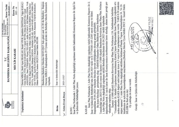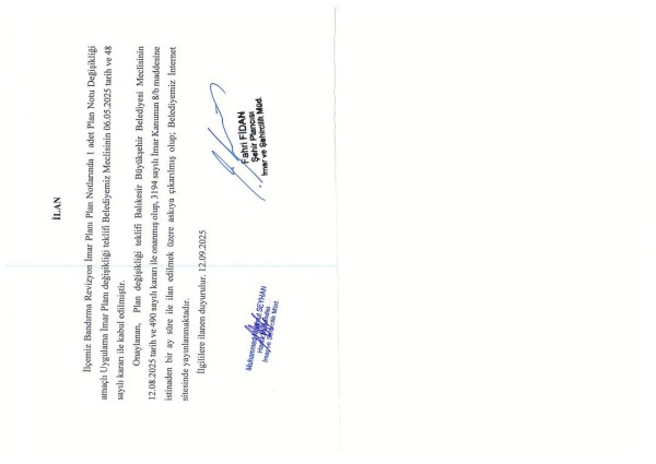İlçemiz Bandırma Revizyon İmar Planı Plan Notlarında 1 adet Plan Notu Değişikliği amaçlı Uygulama İmar Planı değişikliği teklifi Belediyemiz Meclisinin 06.05.2025 tarih ve 48 sayılı kararı ile kabul edilmiştir.