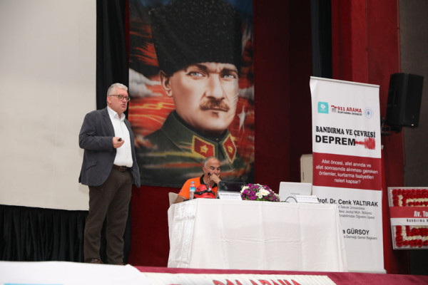 “BANDIRMA VE ÇEVRESİ DEPREM” KONULU PANEL GERÇEKLEŞTİ   Bandırma Belediyesi ve 911 Arama Kurtarma & Dağcılık Kulübünün ortaklaşa düzenlediği “Bandırma ve Çevresi Deprem” isimli panel gerçekleşti.   Prof. Dr. Cenk Yaltırak gerçekleşen panelde, geçmişte Marmara’da yaşanan depremler ve yaşanabilecek olası depremler hakkında, Marmara bölgesindeki fay hatları ve bu fay hatlarının bölgemize ve Marmara’ya etkileri konusunda dinleyicilere çok önemli bilgiler verdi. Bandırma 911 Arama Kurtarma Genel Başkanı Mustafa Gürsoy da dinleyenlere afet öncesi, afet anında ve afet sonrasında alınması gereken önemler, kurtarma faaliyetleri konularında bilgiler sundu.   Belediye Başkan Yardımcımız Metin Ok, Belediye Meclis Üyelerimiz Mesut Özdemir ve Aydilek Gönenç, Prof. Dr. Cenk Yaltırak’a katılımlarından dolayı teşekkür ederek Bandırma’yı simgeleyen plaketlerini takdim ettiler. Ayrıca panel sonunda 911 Arama Kurtarma Derneği tarafından verilen AHATES eğitimlerinde başarı sağlayan öğrencilere belgeleri verildi.