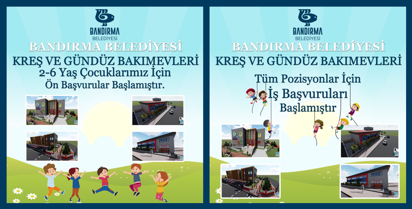 BAŞVURULARINIZI BEKLİYORUZ. Bandırma Belediyesi, 2021-2022 eğitim ve öğretim yılında hizmet vermeye başlayacak olan Yeni Kreş ve Gündüz Bakımevlerinin tüm pozisyonları için iş başvuru süreçleriyle birlikte kreş hizmetinden yararlanmak isteyen vatandaşlarımızın 2-6 yaş arası çocuklarının ön kaydı için başvuru sürecini başlatıyor. Belediye Başkanı Av.Tolga Tosun’un seçim öncesinde vaat ettiği ve okul öncesi eğitimde fırsat eşitliği sağlanması adına önemli bir proje olarak kabul edilen Yeni Çocuk Kreşi ve Gündüz Bakımevleri Projelerinden Levent ve 600 Evler Mahallesi Gündüz Bakımevi için hem 2-6 yaş arası çocuklarımızın ön kayıtları için hem de tüm pozisyonlar için iş başvuru süreci başlıyor. Başvurular Belediyemiz internet sitesinden ve altta verilen linklerden yapılacak. Konuyla ilgili başvuruda bulunmak isteyen vatandaşlarımız Belediyemiz internet sitesinde yer alan linklere veya haberimizin alt bölümünde yer verilen linklere tıklayıp ilgili formları doldurmak suretiyle online olarak sisteme kayıtlarını yaptırmış olacaklar.   2-6 YAŞ ÖĞRENCİ ÖN BAŞVURU FORMU https://l24.im/iY7   TÜM POZİSYONLAR İÇİN ÖN BAŞVURU FORMU https://forms.gle/PXcsYs8aSy2rRi8o9