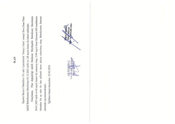 İlçemiz Bezirci Mahallesi 101 ada 5 parsellerde ‘Sanayi Alanı’ amaçlı İlave İmar Planı teklifi Belediyemiz Meclisinin 05.12.2023 tarih ve 128 sayılı kararı ile kabul edilmiştir.