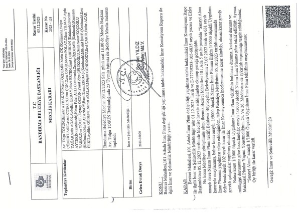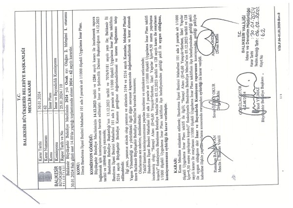 Onaylanan, Plan değişikliği teklifi Balıkesir Büyükşehir Belediyesi Meclisinin 30.01.2023 tarih ve 62 sayılı kararı ile onanmış olup, 3194 sayılı İmar Kanunun 8/b maddesine istinaden bir ay süre ile ilan edilmek üzere askıya çıkarılmış olup; Belediyemiz İnternet sitesinde yayınlanmaktadır.