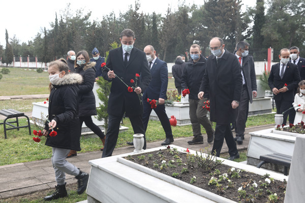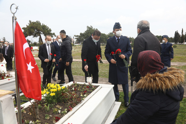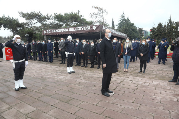ÇANAKKALE ŞEHİTLERİ ŞEHİTLİKTE DÜZENLENEN TÖRENLE ANILDI 18 Mart Çanakkale Şehitlerini Anma ve Şehitler günü sebebiyle Bandırma Şehitliğinde tören düzenlendi. Törene İlçe Kaymakamı Günhan Yazar, Garnizon Komutanı Hv. Plt. Tuğ. General Oğuz Okuyucu, Bandırma Belediye Başkanı Av. Tolga Tosun, Cumhuriyet Başsavcısı Cüneyt Demirdaş, Adalet Komisyon Başkanı Mehmet Tarakçı, 17 Eylül Üniversitesi Rektörü Prof. Dr. Süleyman Özdemir, Emniyet Müdürü Soner Duran, İlçe Jandarma Komutanı Yzb. Mahir Mavi, İlçe Milli Eğitim Müdürü Mutlu Aslan, siyasi parti temsilcileri, dernek temsilcileri, şehit yakınları ve gaziler katıldı. Tören, şehitlik anıtına çelenk konulması, saygı duruşu saygı atışı ve İstiklal marşının okunması ile başladı. Ardından günün anlam ve önemini belirten konuşmayla devam edildi. Protokolün ve törene katılanların şehitlerin mezarlarına çiçek bırakması ile devam ederken, şehitlerin mezarları başında dualar okunmasının ardından tören sona erdi.