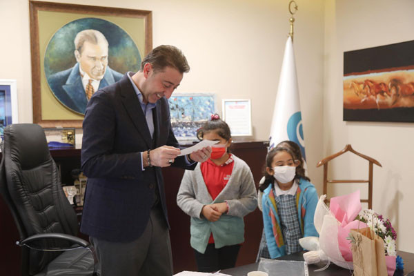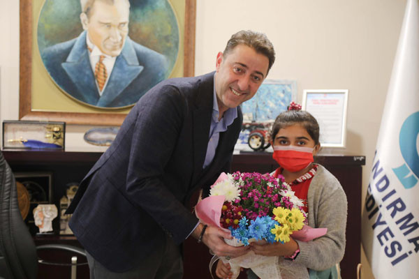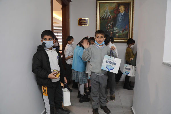 ÇOCUKLARDAN BAŞKANA “ÖLÜMSÜZLÜK SUYU”   “Mücadelemiz insanlık için vazgeçilmez olan değerlerimize sahip çıkmak.”   Çalışkanlar İlkokulu Müdürü İlkay Sönmez ve öğrencileri Belediye Başkanı Av. Tolga Tosun’u makamında ziyaret ettiler. Çalışkanlar İlkokulu önceki dönem öğrencilerinin diktikleri ağaçlardan toplanan zeytinleri, günümüz öğrencileri lezzetli zeytinyağına dönüştürdüler. Ölümsüzlük ağacı olarak bilinen zeytin ağacının zeytinlerinden elde edilen zeytin suyunu Belediye Başkanı Av. Tolga Tosun’a sunan minik öğrencileri makamında ağırlayan başkan; içinde bulunduğumuz haftanın Yerli Malı Haftası olduğuna da dikkat çekti.   Çalışkanlar İlkokulu öğrencilerinin kendi elleriyle yaptıkları resimleri de hediye etmelerinden duyduğu mutluluğu ifade eden Belediye Başkanı Av. Tolga Tosun; “Çocuklarımızın el emekleri benim için çok değerli. Çocuklarla birlikte vakit geçirmek bana inanılmaz bir enerji veriyor. Ölümsüzlük ağacı olarak bilinen zeytin ağacının bölgemiz hatta ülkemiz ve dünyamız için çok değerli olduğu yadsınamaz bir gerçek. Çocuklarımızın bu yaşta bu tür etkinlikler yaparak, bu bilinçle yetişiyor olmalarını görmekten büyük bir mutluluk duydum. Mücadelemiz insanlık için vazgeçilmez olan değerlerimize sahip çıkmak. Bugün geldiğimiz noktada bu mücadele her zaman olduğundan daha çok önem kazanmıştır.”   Bandırma Belediye Başkanı Av. Tolga Tosun; Çalışkanlar İlkokulu Müdürü İlkay Sönmez’e bu bilinci çocuklarımıza aşıladıkları için teşekkür etti. Kendisine bu mutluluğu yaşatan geleceğimizin teminatı ve mimarı olacak olan ziyaretçilerine de takdim ettiği özel hediye paketi ile teşekkür etti.