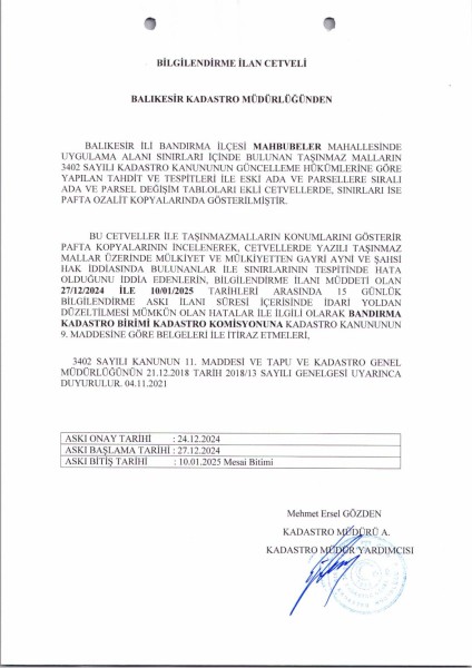 Bandırma İlçesi Mahbubeler Mahallesi sınırları içerisinde bulunan taşınmaz malların 3402 sayılı Kadastro Kanunun 22 inci maddesi kapsamında yapılan Kadastro güncelleme çalışmaları tamamlanarak kesin askı İlanı Cetveli ve Pafta Ozalitlerinin, 27.12.2024 ile 10.01.2025 tarihleri arasında müdürlüğünüzce ilan edilmesini ve askı ilan tutanağının tarafımıza gönderilmesini rica ederim.