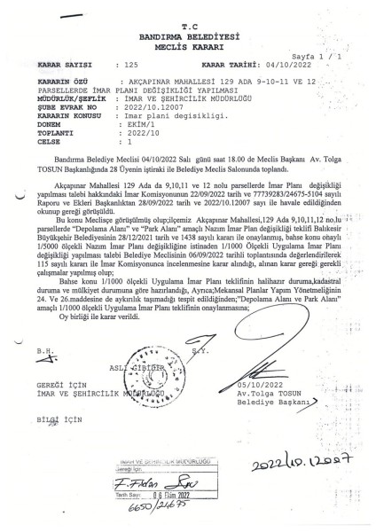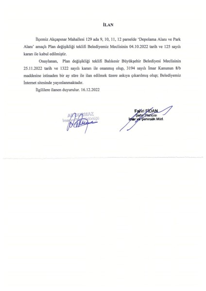 İlçemiz Akçapınar Mahallesi 129 ada 9, 10, 11, 12 parselde ‘Depolama Alanı ve Park Alanı’ amaçlı Plan değişikliği teklifi Belediyemiz Meclisinin 04.10.2022 tarih ve 125 sayılı kararı ile kabul edilmiştir.