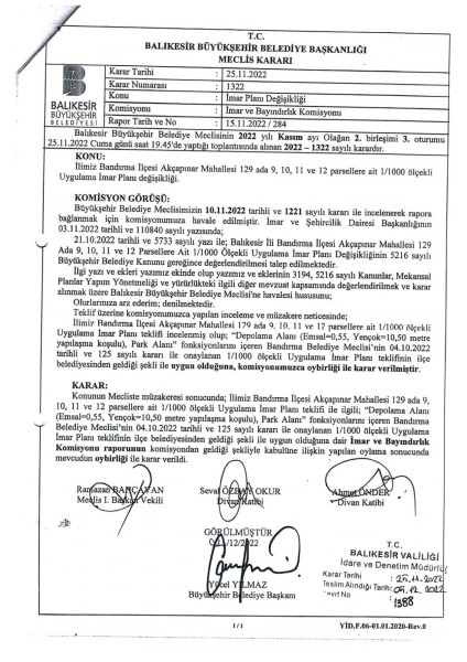 Onaylanan, Plan değişikliği teklifi Balıkesir Büyükşehir Belediyesi Meclisinin 25.11.2022 tarih ve 1322 sayılı kararı ile onanmış olup, 3194 sayılı İmar Kanunun 8/b maddesine istinaden bir ay süre ile ilan edilmek üzere askıya çıkarılmış olup; Belediyemiz İnternet sitesinde yayınlanmaktadır.