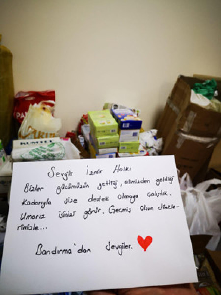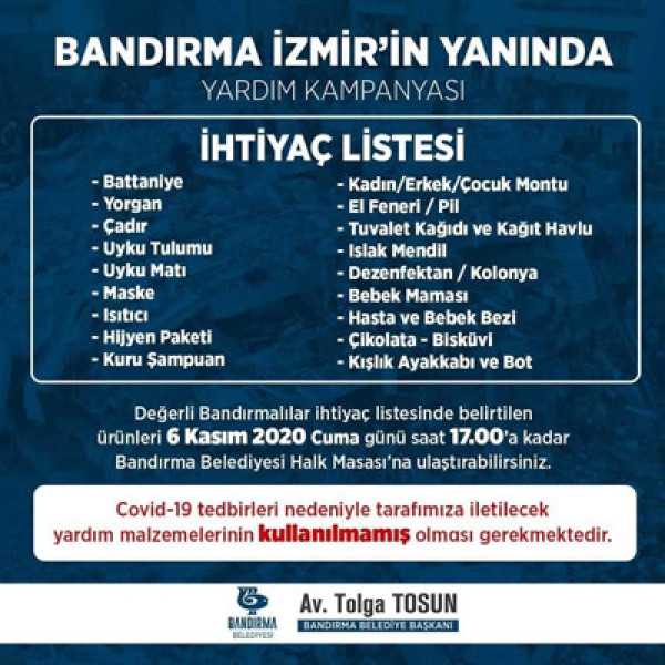 İZMİR’E GİDECEK YARDIMLAR HAZIRLANIYOR   İzmir depremi sonrasında Belediyemiz tarafından başlatılan yardım kampanyasına vatandaşlarımızın ilgisi yoğun.   Yarın saat 17:00'a kadar belirtilen ihtiyaç listesindeki malzemeleri Belediyemize ulaştırarak bu yardım kampanyasına siz de destek olabilirsiniz. Vatandaşlarımızın salgını yoğun şekilde yaşadığımız şu günlerde getirecekleri ihtiyaç malzemelerinin kullanılmamış olması gerekmektedir. İkinci el giysi gibi kullanılmış kıyafet ve malzemeler kabul edilmeyecektir.