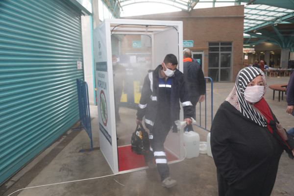 KAPALI PAZAR YERİNE MOBİL DEZENFEKTAN KABİNLERİ MONTE EDİLDİ
