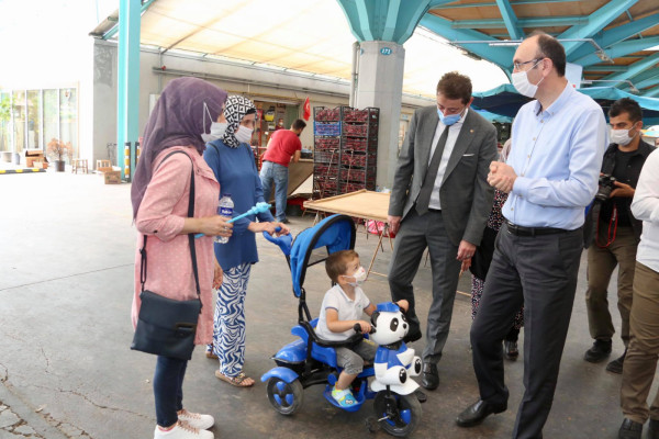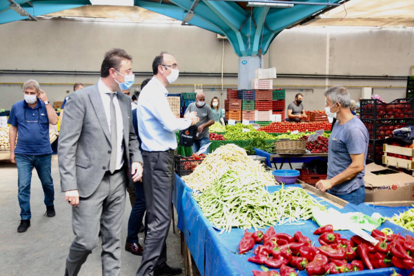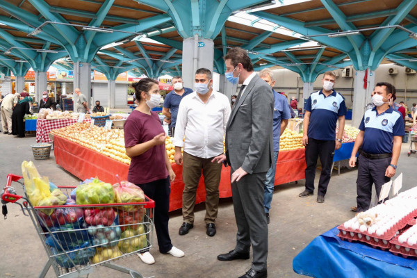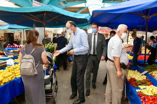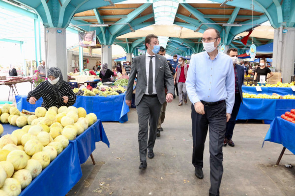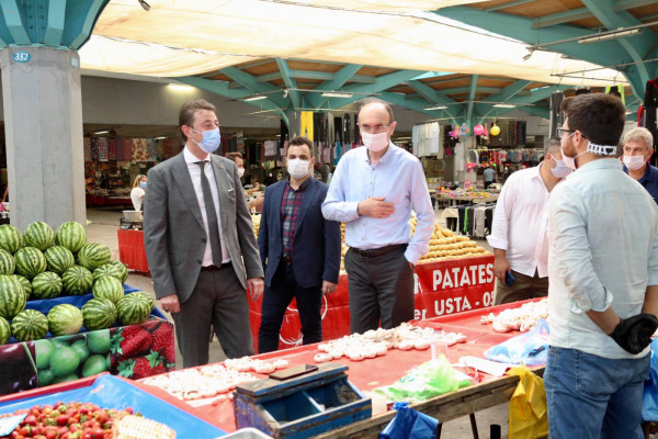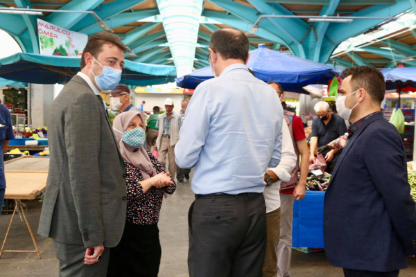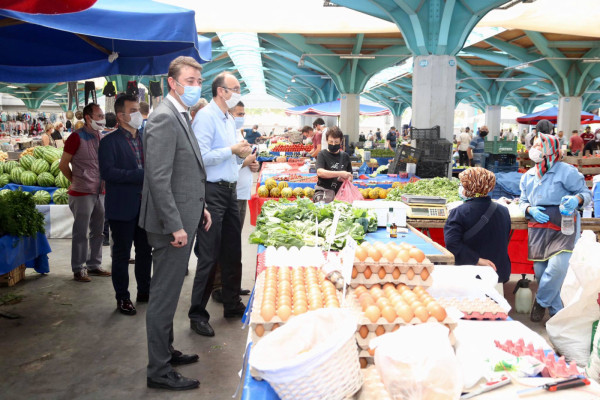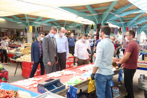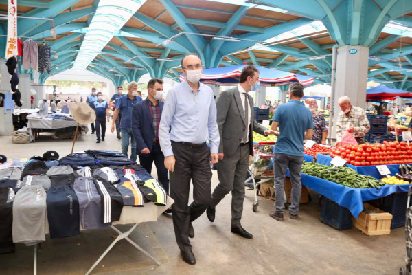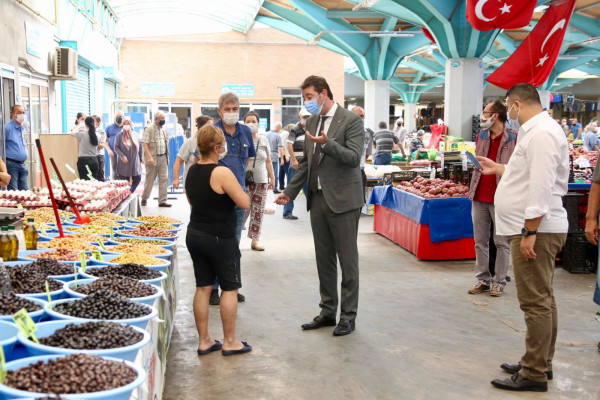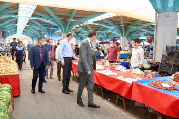 KAYMAKAM VE BAŞKAN PAZAR YERİ DENETLEDİ   Belediye Başkanı Av. Tolga Tosun, Kaymakam Günhan Yazar, İlçe Emniyet Müdürü Soner Duran’la birlikte Kapalı Pazar Yerini ziyaret ederek esnafı ve vatandaşlar Pandemi kurallarına uyma konusunda uyarılarda bulundular.   Belediye Başkanı Av. Tolga Tosun: “Bu zor süreci kurallara uyarak hep birlikte top yekün mücadele ederek atlatacağız. Lütfen kurallara uyalım” dedi.