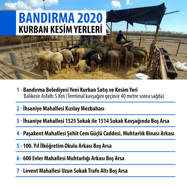 Buna göre dört gün sürecek olan Kurban Bayramı boyunca vatandaşlarımız Kurbanlarını ilgili komisyonca belirlenmiş olan yerlerde kesebilecekler. Kesim yapılacak olan yerlerde vatandaşlarımızın sosyal mesafeye ve hijyen kurallarına uyarak hareket etmesi önemle rica ederiz. 1-Bandırma Belediyesi Yeni Kurban Satış ve Kesim Yeri (Balıkesir Asfaltı 5. Km, Terminal Kavşağını geçince 40 metre sonra sağda) 2-İhsaniye Mahallesi Kızılay Mezbahası 3-İhsaniye Mahallesi 1525 sokak ve 1514 sokak kavşağındaki boş arsa (Trafo Yanı) 4-Paşakent Mahallesi Şehit Cem Güçlü Caddesi üzeri (Muhtarlık Binasının arka kısmı) 5-100.yıl İlköğretim Okulu arkasında boş arsa 6-600 Evler Mahallesi Muhtarlığı arkasındaki boş arsa 7-Levent Mahallesi Uzun Sokak üzerindeki trafo altında yer alan boş arsa