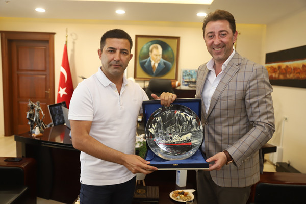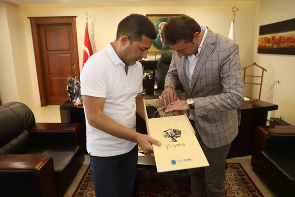 KUŞADASI BELEDİYE BAŞKANINDAN ZİYARET   Kuşadası Belediye Başkanı Ömer Günel, Belediye Başkan Yardımcıları ve daire müdürleri ile birlikte Belediye Başkanı Av. Tolga Tosun’a makamında nezaket ziyareti gerçekleştirdiler.   Ziyarette Belediye çalışmaları ve gündeme dair sohbet eden iki başkan ziyaret sonunda birbirlerine kentlerini temsil eden hediyeler takdim ettiler.