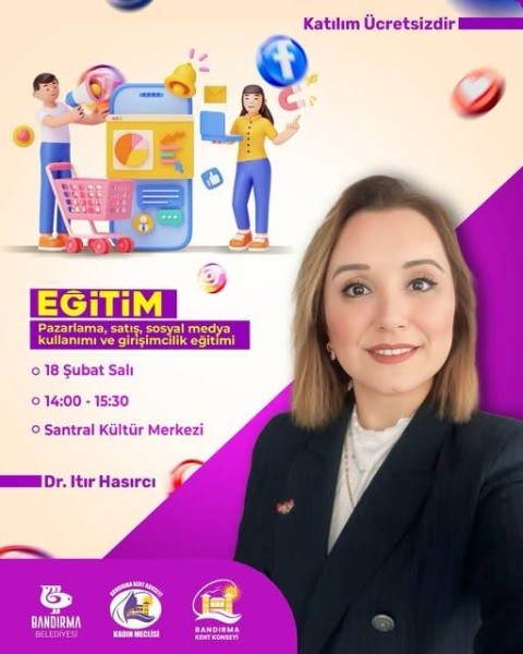 Bandırma Kent Konseyi Kadın Meclisi’nin katkılarıyla Dr. Itır Hasırcı ile pazarlama, satış ve sosyal medya kullanımının girişimcilikteki önemini konuşuyoruz. 18 Şubat Salı 14:00 - 15:30 Santral Kültür Merkezi Ücretsiz olarak gerçekleşecek bu eğitime tüm girişimcilerimizi ve ilgi duyan herkesi bekliyoruz!