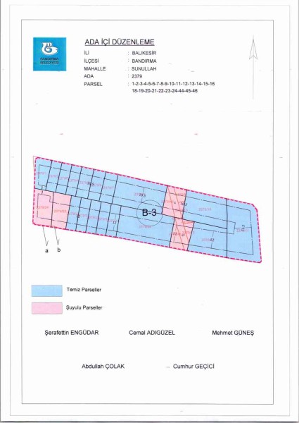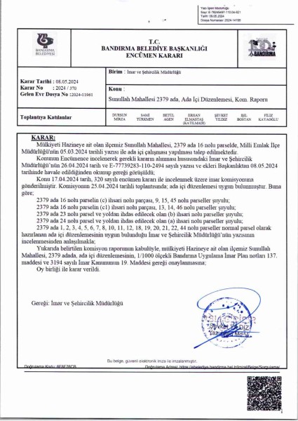 Belediye Encümeninin 08.05.2024 tarih ve 370 sayılı Encümen kararı ile Sunullah Mahallesi, 2379 ada 1-2-3-4-5-6-7-8-9-10-11-12-13-14-15-16-18-19-20-21-22-23-24-44-45-46 nolu parsellere ait ada içi düzenlemesinin, 1/1000 ölçekli Bandırma Uygulama İmar Planı notlarının 137. Maddesi ve 3194 sayılı İmar Kanununun 19. maddesi gereği onaylanmasına,