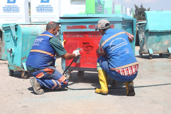 TOPLUM SAĞLIĞI İÇİN TEMİZ BİR ÇEVRE   Bandırma Belediyesi ekipleri, salgın nedeniyle yerine getirdiği dezenfekte çalışmalarının yanı sıra kent genelinde temizlik, konteyner bakım ve onarım çalışmalarını da sürdürüyor. Çalışmalar kapsamında konteynerleri detaylı bir şekilde temizleyen ekipler, yıkamanın ardından konteynerler parfüm sıkarak sıcak havalarda oluşabilecek kötü kokunun da önüne geçilmesini hedefliyor.   Bununla birlikte hasar görmüş, arızalı konteynerler ekiplerimiz tarafından tespit edilip yerinde onarımları gerçekleştiriliyor. Ayrıca yerinde onarılamayacak durumda olan konteynerler ise Belediye Şantiyesinde tamir ve boyama işlemi yapılıp tekrardan eski yerine bırakılıyor.   Bandırma’nın her bir mahallesinde çalışmalar devam ediyor.   Ekiplerimiz ana caddeler, ara sokaklar, parklar, boş arsalar ve vatandaşlarımız tarafından talep edilen tüm alanların düzenli olarak mıntıka temizlikleri yapılıyor. Öte yandan ana caddeler ve yollar düzenli olarak yıkanıp süpürüldükten sonra, dezenfekte edilerek vatandaşlarımız için oluşabilecek risklerin önüne geçilmesi amaçlanıyor.   Toplum sağlığı adına maske ve eldivenleri çöp kutularına atalım.   Belediye olarak vatandaşlarımızdan zor geçen bu salgın günlerinde çevremizi temiz tutmaları konusunda daha fazla özen göstermelerini rica ediyoruz. Maske ve eldivenlerin en yakında bulunan kapalı çöp kutularına atılmasını rica ediyoruz. Toplumumuzun sağlığını korumak için aldığımız önlemlere siz değerli vatandaşlarımızın bireysel olarak aldığı önlemlerde eklenince covid-19 salgınını en kısa sürede yenerek normal yaşantımıza döneceğiz.
